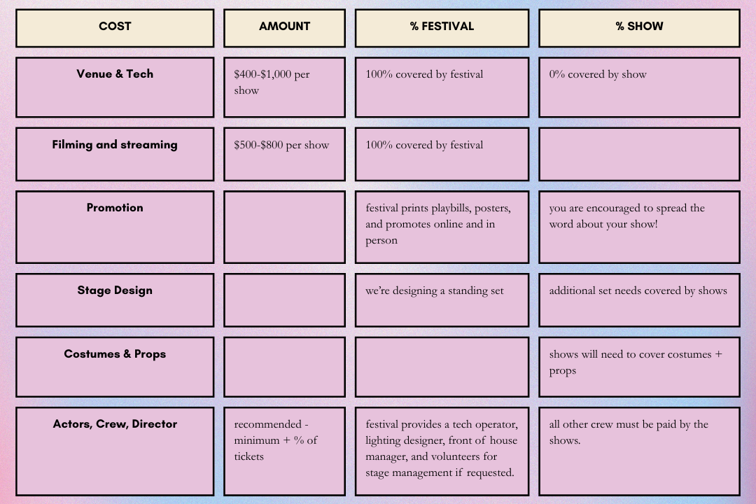 and …What you need to make this worthwhile (Theater is expensive! We typically provide a venue and tech—can you make it work with that? You'll also get the bulk of money from ticket sales, but obviously, people need to buy tickets for that to work.)